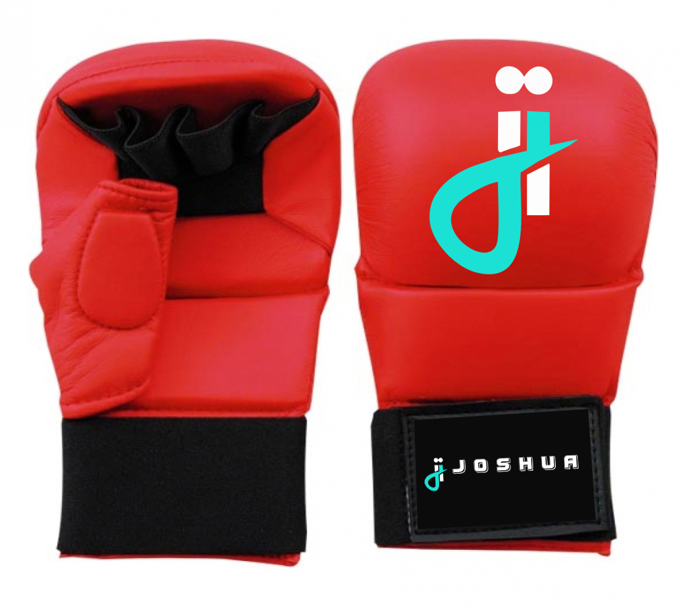 Karate protective gloves made of PU inside palm of string cotton, filled with latex mold with round elastic velcrom closing.